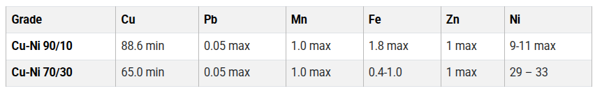 90/10 Copper Nickel (CuNi 90/10) Pipes & Tubes: Contains 90% copper and 10% nickel, plus trace elements like iron and manganese for additional strength and corrosion resistance.